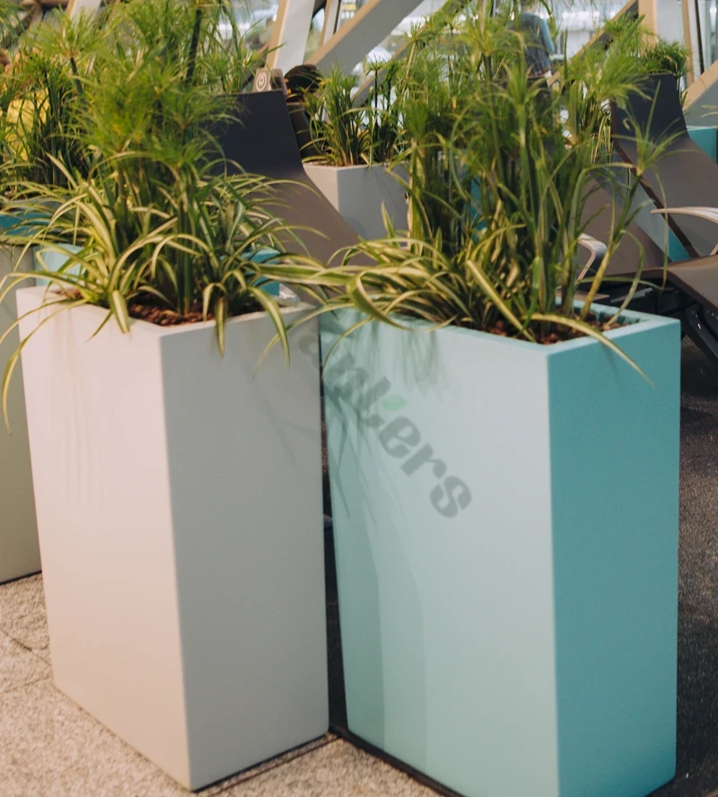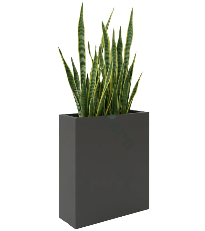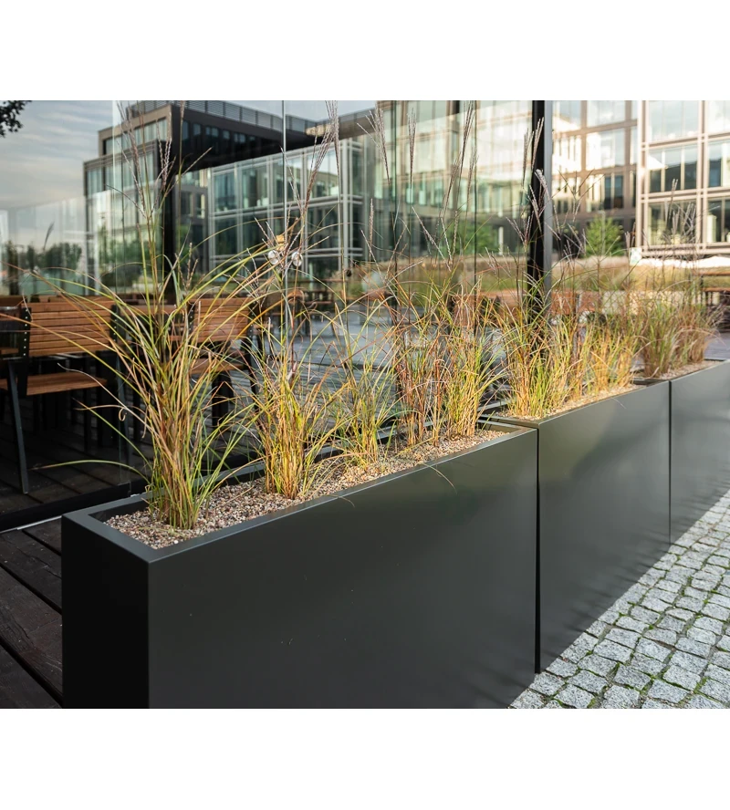Donica z włókna szklanego wyróżnia się nowoczesnym i oryginalnym designem, dzięki matowemu wykończeniu. Mat nadaje donicy wyjątkowego uroku, który doskonale komponuje się z różnymi stylami wnętrz i ogrodów. Prostokątna forma jest idealna do stworzenia harmonijnych aranżacji roślinnych i wypełnienia pustych przestrzeni np. w biurze, restauracji czy holu hotelowym.