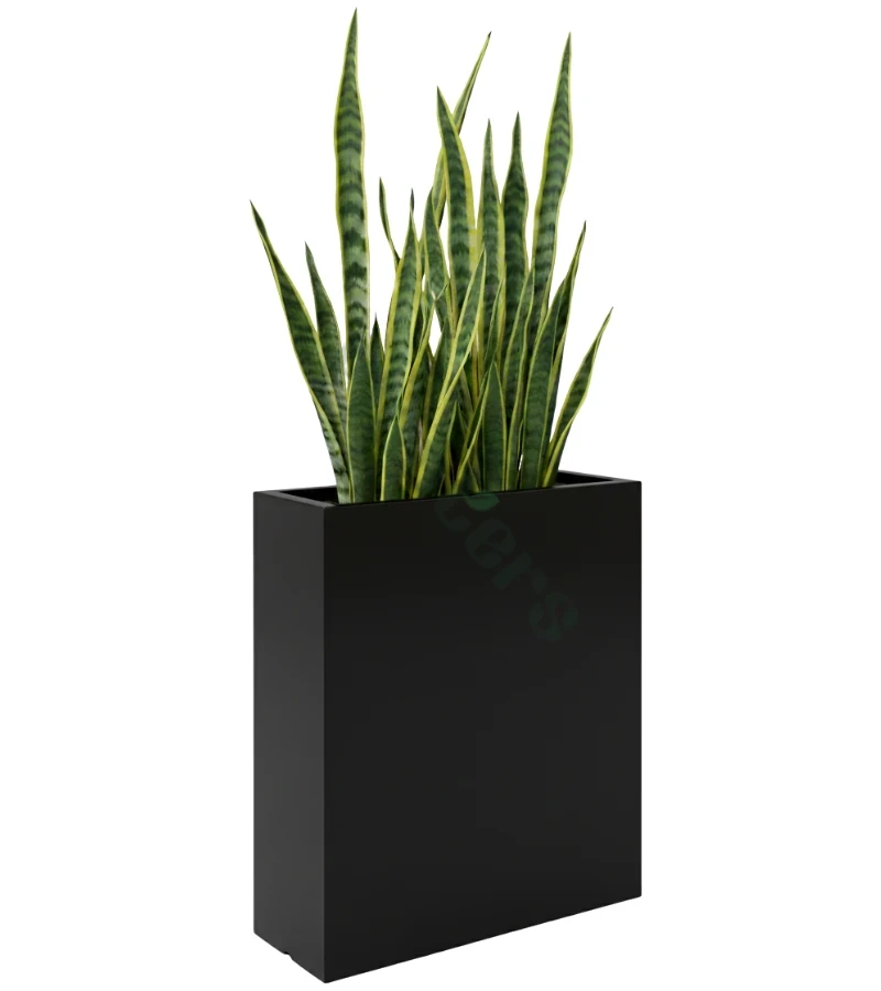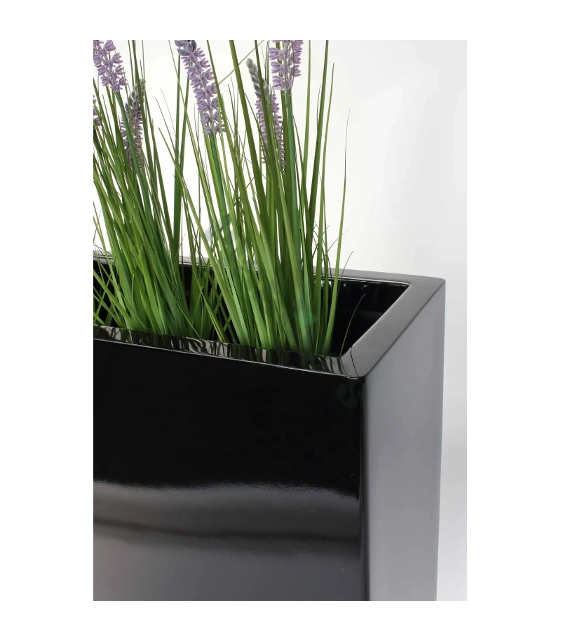 Wysoka donica prostokątna z włókna szklanego w eleganckim kolorze czarnym łączy w sobie cechy produktu dekoracyjnego z wysoką funkcjonalnością, które sprawiają, że jest idealna do dekoracji zarówno wnętrz, jak i zewnętrznych przestrzeni. Donica pomimo dużych rozmiarów jest niezwykle lekka, co znacząco ułatwia jej przenoszenie i ustawianie według własnych upodobań. Ponadto, donica jest bezproblemowa podczas sadzenia roślin i dbania o nie. Sprawdzi się do większości kompozycji zielonych np. do sansewierii, monster czy traw ozdobnych.